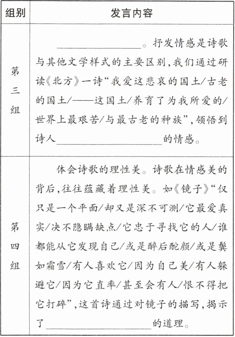 |第三组|______。抒发情感是诗歌与其他文学样式的主要区别,我们通过研读《北方》一诗“我爱这悲哀的国土/古老的国土/——这国土/养育了为我所爱的/世界上最艰苦/与最古老的种族”,领悟到诗人______的情感。|