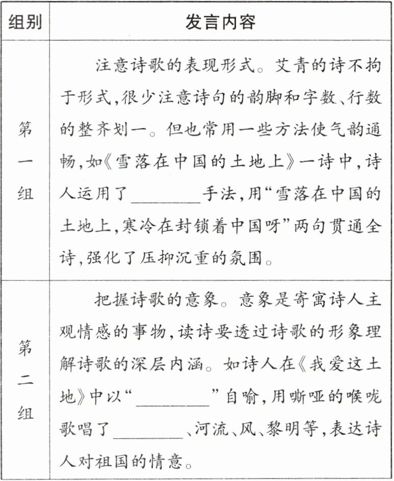 |第二组|把握诗歌的意象。意象是寄寓诗人主观情感的事物,读诗要透过诗歌的形象理解诗歌的深层内涵。如诗人在《我爱这土地》中以“______”自喻,用嘶哑的喉咙歌唱了______、河流、风、黎明等,表达诗人对祖国的情意。|