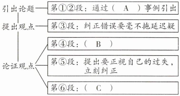 $\begin{cases}引出论题\begin{cases}第①②段:通过(A)事例引出\\第③段:纠正错误要毫不拖延迟疑\end{cases} \\论证观点\begin{cases}第④段:(B)\\第⑤段:提出要正视自己的过失,立刻纠正\\第⑥段:(C)\end{cases} \end{cases}$
