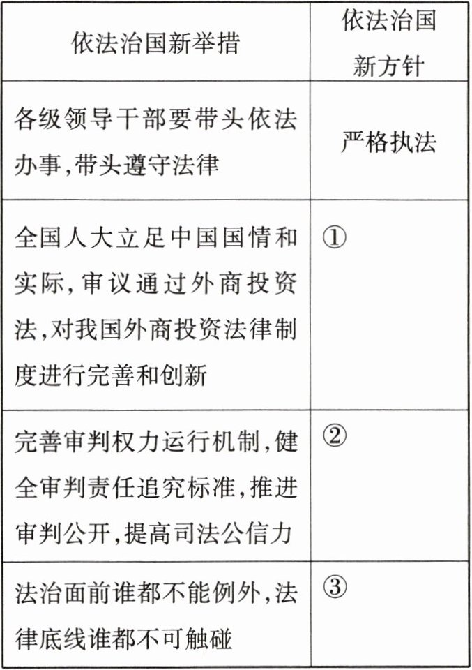 材料二 习近平总书记在对《中共中央关于全面推进依法治国若干重大问题的决定》的说明中指出:“天下之事,不难于立法,而难于法之必行。”