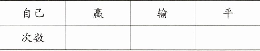 2. 和你的同桌玩一玩“剪刀、石头、布”的游戏,玩 20 次,分别记录你和同桌赢、输、平的结果,再填写到下面的统计表中。观察表中的数据,你有什么发现?