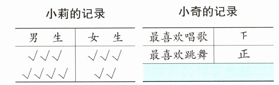 小莉和小奇分别按不同的内容对第一组同学进行调查并记录如下。小奇记录的结果有一行被遮住了,被遮住的可能是(