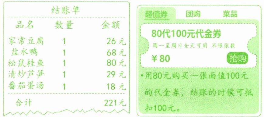 7. 琪琪一家去餐厅就餐,结账单如下,结账前他们购买了 2 张代金券。