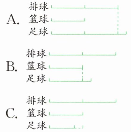 (7) 排球有$16$个,篮球的个数是排球的一半,足球比篮球少$2$个。下面线段图符合题意的是(