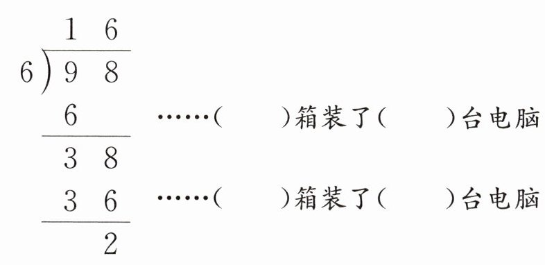 (5) 家电商场有一批电脑,一共 98 台。每 6 台装一箱,这些电脑要装多少箱?还剩多少台?