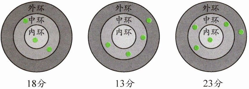 7. 一种射击游戏,射中内环、中环、外环的得分各不相同。小奇玩了三轮,下面是他的得分情况。