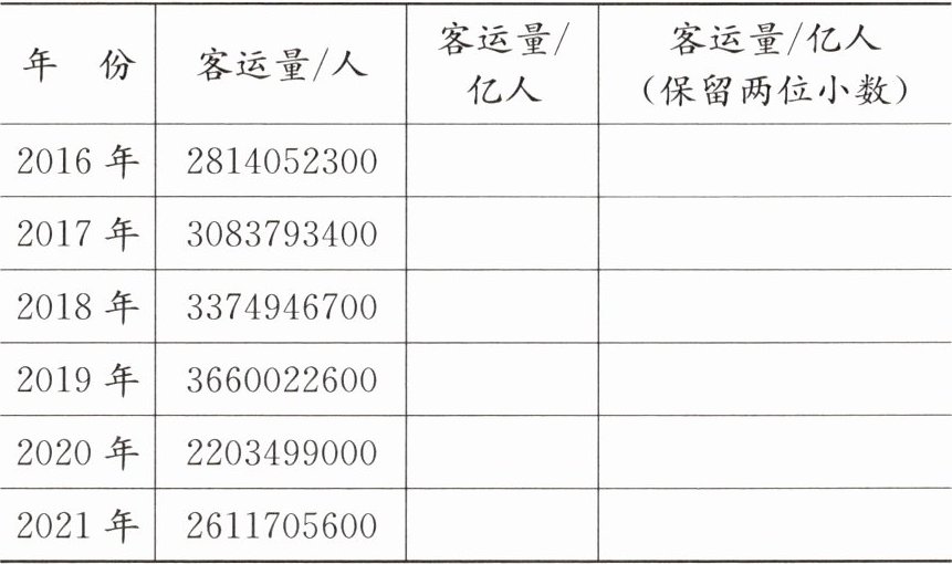 3.〈table〉年 份 客运量/人 客运量/亿人 客运量/亿人(保留两位小数)2016年 2814052300 28.140523 28.142017年 3083793400 30.837934 30.842018年 3374946700 33.749467 33.752019年 3660022600 36.600226 36.602020年 2203499000 22.03499 22.032021年 2611705600 26.117056 26.12〈/table〉