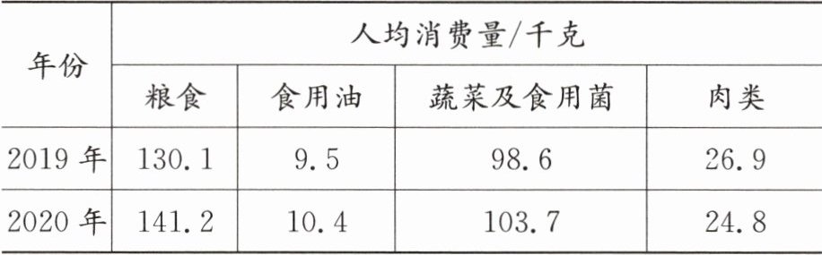 2. 2019年和2020年我国居民人均主要食品消费量统计如下表: