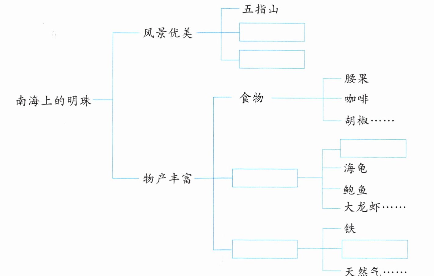 (1)海南岛是祖国的第二大岛,土地肥沃,物产丰富。 海南岛一年四季气候宜人,风景优美。 海南岛的椰林风光最惹人喜爱。