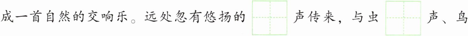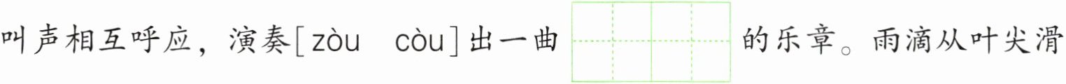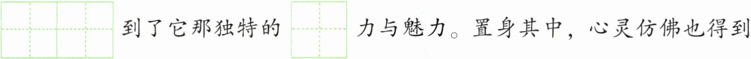 雨过后,郊外的空气里[充 冲]满泥土与青草的芬芳。林间的鸟儿们时而欢快高歌,时而在枝头呢喃[ nì nān ní nán ],与溪水的流淌声汇聚成一首自然的交响乐。远处忽有悠扬的$\begin{array}{|c|c|}\hline & qín \\ \hline & \\ \hline\end{array}\\ \hline & \\ \hline $声传来,与虫$\begin{array}{|c|c|}\hline & míng \\ \hline & \\ \hline\end{array}\\ \hline & \\ \hline $声、鸟叫声相互呼应,演奏[ zòu còu ]出一曲$\begin{array}{|c|c|c|c|}\hline & & měi & miào \\ \hline & & & \\ \hline\end{array}\\ \hline & & & \\ \hline $的乐章。雨滴从叶尖滑落,滴答滴答敲打着地面,像是大自然在玩打[激 击]乐器,让人真切$\begin{array}{|c|c|c|c|}\hline & & gǎn & shòu \\ \hline & & & \\ \hline\end{array}\\ \hline & & & \\ \hline $到了它那独特的$\begin{array}{|c|c|}\hline & wèi \\ \hline & \\ \hline\end{array}\\ \hline & \\ \hline $力与魅力。置身其中,心灵仿佛也得到了净化与洗礼。