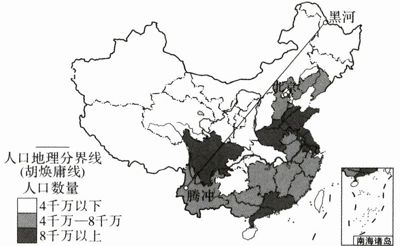 7. 图中西南—东北向实线是我国的人口地理分界线,确定该线位置的主要依据是(