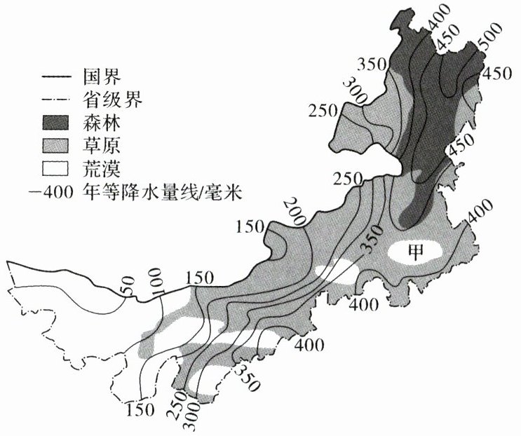 下图为内蒙古自治区年等降水量线和植被分布图。读图,完成9~10题。