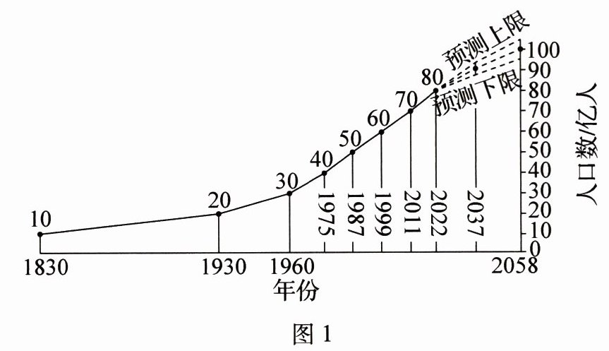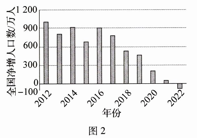2022 年 11 月 15 日为世界 80 亿人口日。与 2021 年相比,2022 年中国人口总数减少了 85 万。图 1 为世界人口增长及预测图,图 2 为 2012—2022 年中国净增人口统计图(不含香港特别行政区、澳门特别行政区和台湾省数据)。读图,完成 8~10 题。