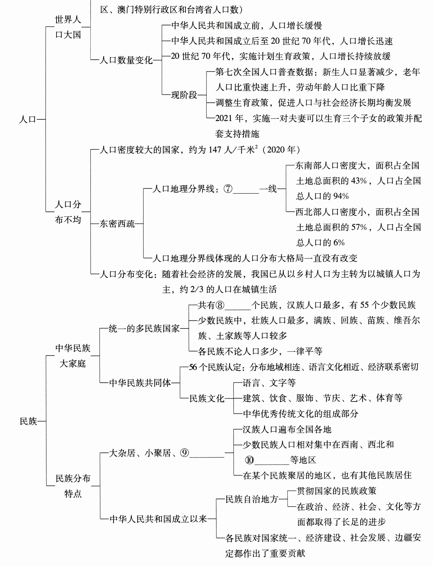 ①北温 ②热 ③太平洋 ④水路 ⑤960万 ⑥太平洋 ⑦黑河—腾冲 ⑧56 ⑨交错居住 ⑩东北