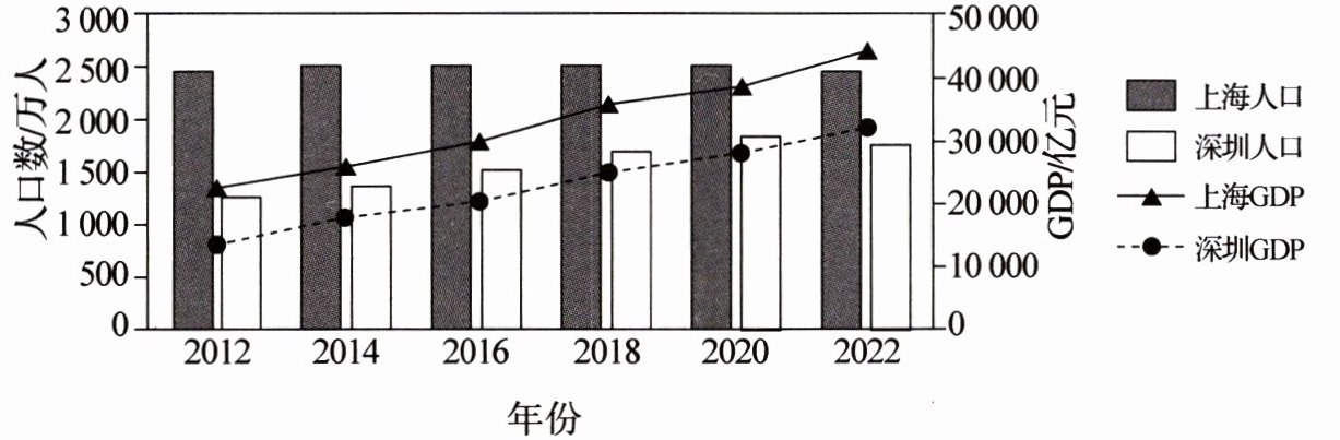 上海、深圳是中国高水平开放与高质量发展的典范。读2012—2022年上海、深圳人口和两个城市国内生产总值(GDP)统计数据图,完成8~9题。