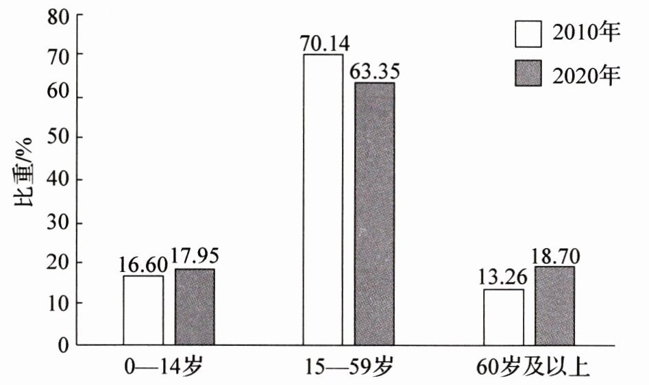 人口年龄结构是指少儿(0—14岁)人口、劳动(15—59岁)人口和老年(60岁及以上)人口的比重情况。下图示意我国2010年和2020年人口年龄结构。读图,完成6~7题。
