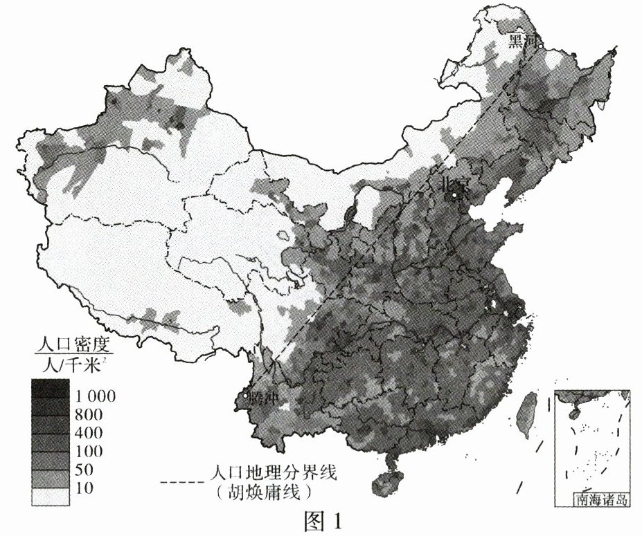 (2)图1中我国东部沿海部分地区人口密度超过800人/千米²,我国西北内陆部分地区人口密度低于10人/千米²。下列关于造成这种人口密度差异原因的表述,正确的是