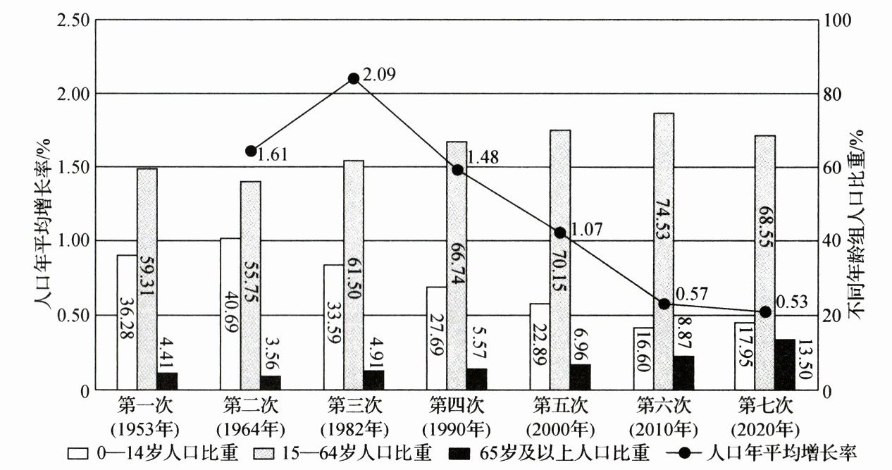 2021年6月,中共中央、国务院印发《关于优化生育政策促进人口长期均衡发展的决定》,实施一对夫妻可以生育三个子女政策,配套实施积极生育支持措施。下面图1为中国人口的分布图(2020年),图2为中国七次人口普查部分数据统计图。