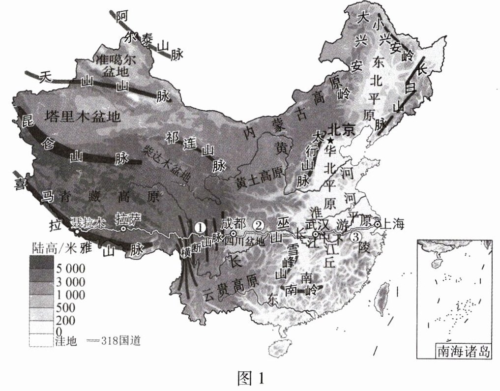 起点为上海市、终点为西藏自治区聂拉木县,全长5476千米的318国道,是中国乃至世界的一条美景高度集中的景观长廊。下面图1是我国主要地形区分布图,图2是沿318国道的地形剖面示意图。