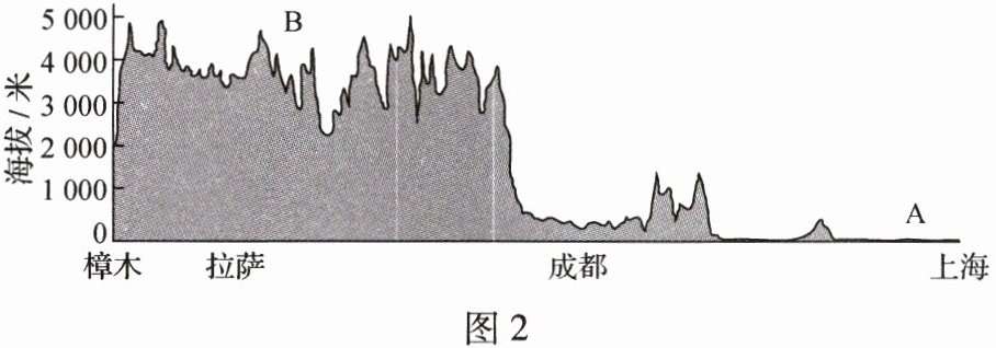 (2)沿318国道的地形剖面示意图中,A地区海拔在200米以下,B地区平均海拔在