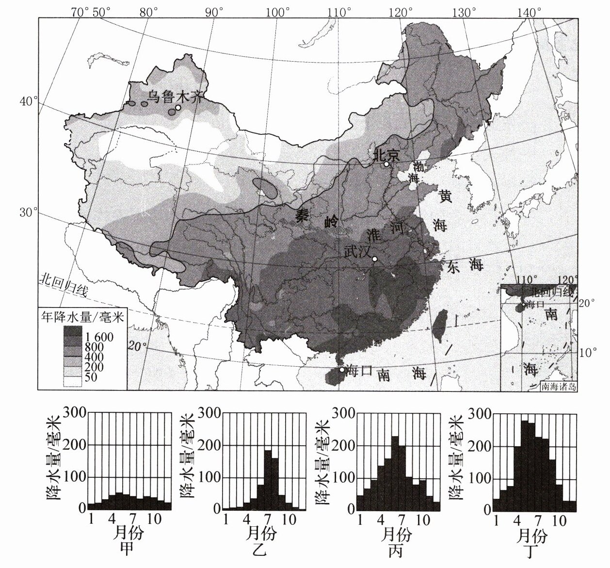 分析降水量分布状况是认识区域差异的重要内容。读中国降水量分布示意图和四地降水量柱状图,完成4~6题。