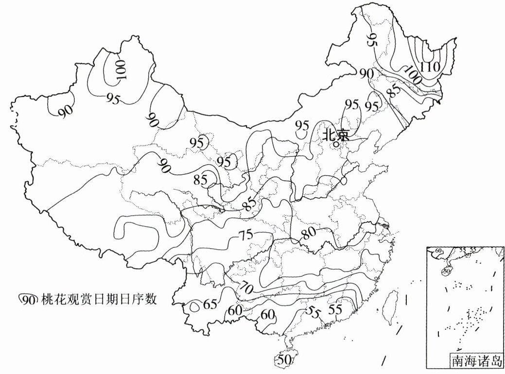 春天,我国各地的桃花竞相开放。下图为我国各地桃花观赏日期日序数分布图(日序数指距离当年1月1日的天数)。读图,完成3~4题。
