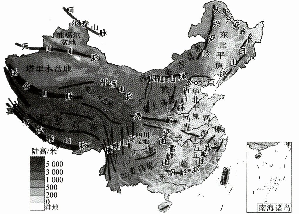 )①山区面积广大 ②平原为主、地势平坦 ③地势西高东低 ④地形多种多样