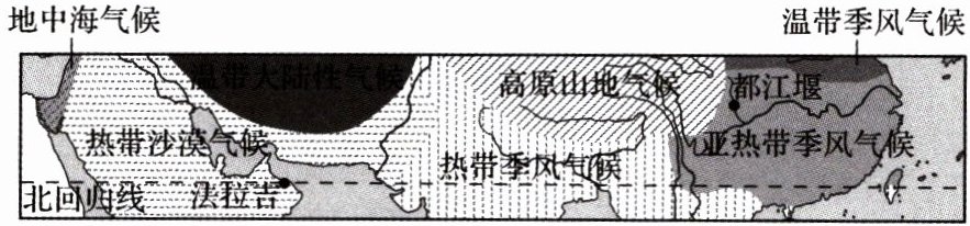 法拉吉和都江堰均是世界灌溉工程遗产。法拉吉将山泉水和地下水通过水渠引到山麓地带的村庄,用于人们的生产、生活。都江堰通过渠、堰调节岷江水,引水保障成都平原的农业生产。下图为亚洲气候类型分布图(局部)。读图,完成14~15题。
