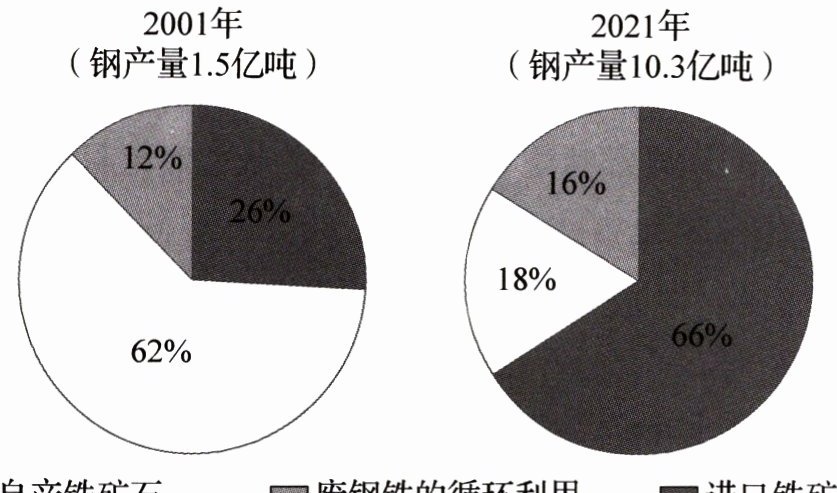 9. 与2001年相比,2021年进口铁矿石在我国钢铁生产原料来源的占比(