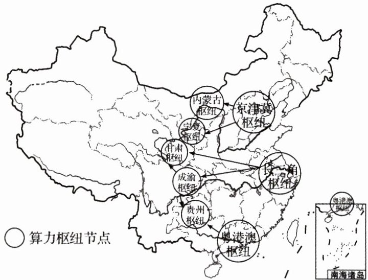 2022年2月,我国全面启动“东数西算”工程,“数”指数据,“算”是算力,即对数据的处理能力。数据的存储、计算和应用,设备的降温都需要消耗大量的电能。“东数西算”指把东部地区经济活动产生的数据传输到西部进行计算和处理。右图为“东数西算”工程示意图。读图,完成11~12题。