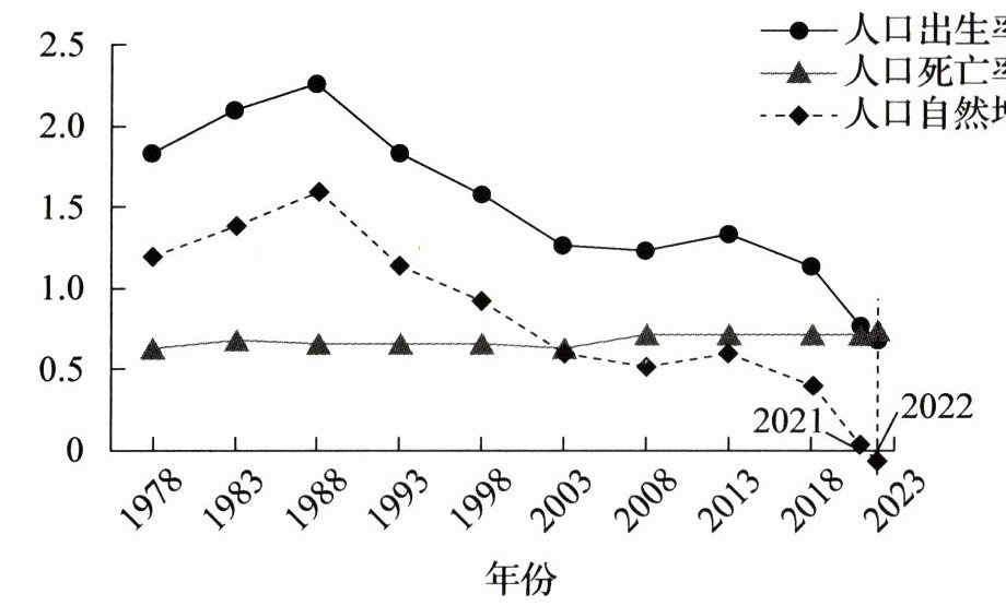 我国人口2022年末比上年末减少85万人。下图为1978—2022年我国人口出生率、死亡率、自然增长率变化示意图。读图,完成3~4题。