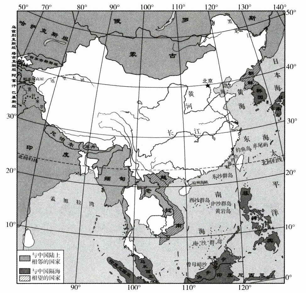 下图为我国的疆域及邻国图。读图,完成1~2题。