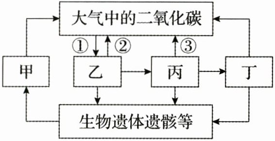 D 解析:绿色植物通过光合作用吸收二氧化碳,所以①表示光合作用。生物通过呼吸作用释放二氧化碳,②③表示呼吸作用。甲是分解者,在碳循环中的作用是将有机物分解为无机物。该生态系统中物质是循环的,而能量是单向流动、逐级递减的。