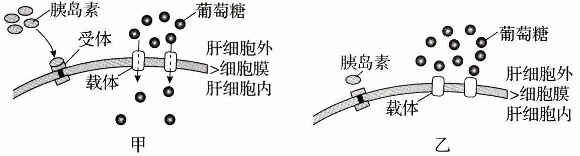 肝细胞和肌细胞吸收血液中的葡萄糖,从而使血糖浓度降低。图甲表示健康人的肝细胞在胰岛素作用下吸收葡萄糖进入细胞,据此分析,图乙最可能是胰岛素分泌______不足
