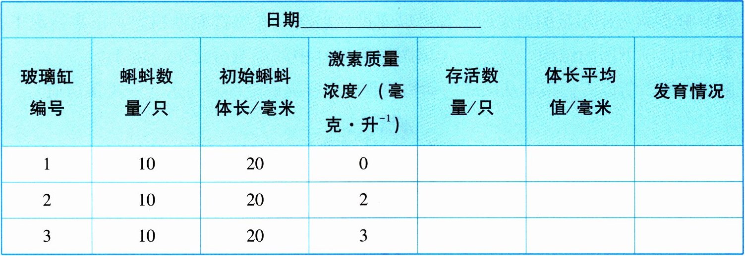 |玻璃缸编号|蝌蚪数量/只|初始蝌蚪体长/毫米|激素质量浓度/(毫克·升$⁻^1)$|存活数量/只|体长平均值/毫米|发育情况|