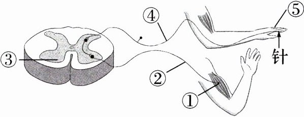3. (安徽滁州模拟)右下图为缩手的反射的反射弧,当②处受损不能传递神经冲动,针刺⑤会出现的现象是(