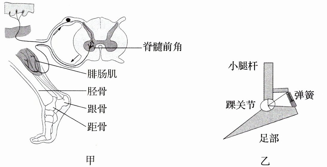 (1)图甲中,正常人行走时,腓肠肌收缩,牵动跟骨带动距骨绕踝关节活动,使足跟上提。腓肠肌属于反射弧中的