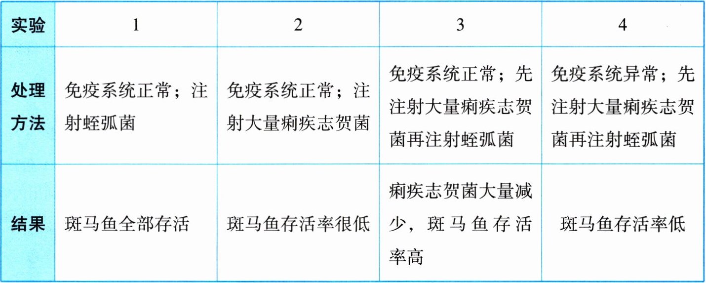 (4)文章中提到的多个实验如下表所示。其中能表明在抗击痢疾志贺菌感染时,蛭弧菌和斑马鱼免疫系统巧妙“配合”的实验组合是