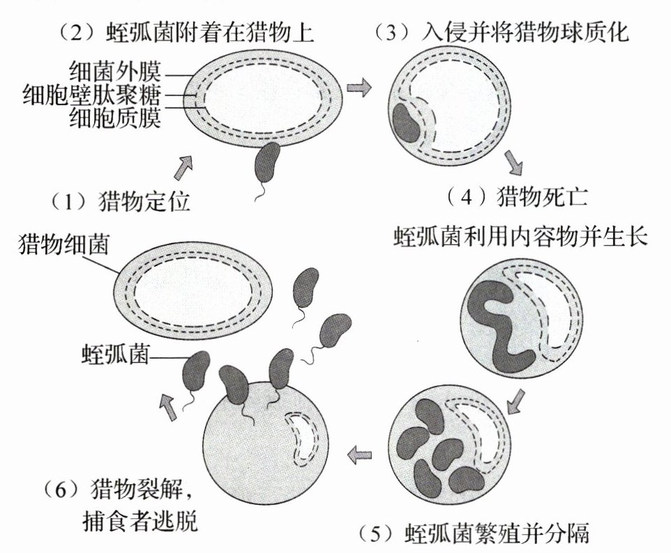 (2)蛭弧菌的“捕食”过程可以分为以下几个阶段:识别→吸附→侵入→利用