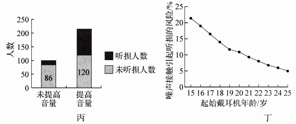 (3)研究人员还发现,起始戴耳机的年龄与听损也存在一定的关系,如图丁所示。据图可知,起始戴耳机年龄超过