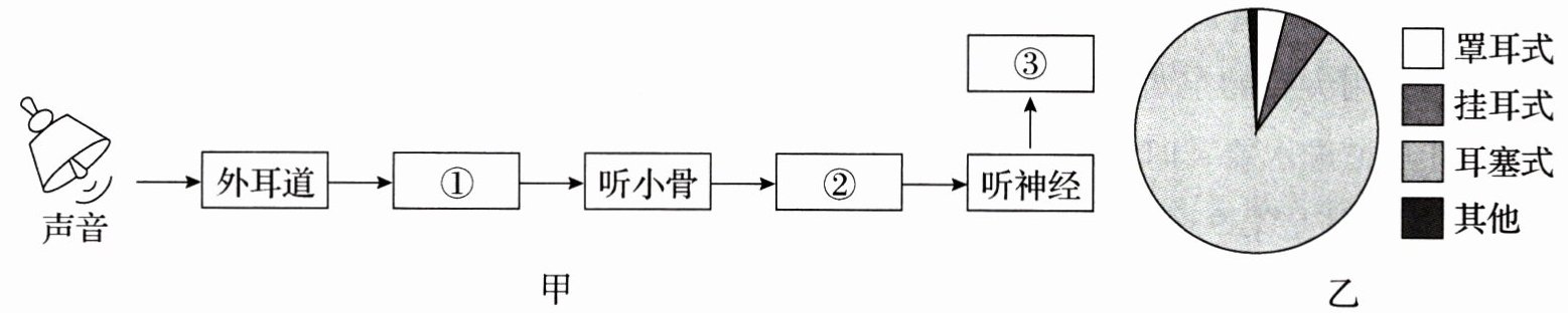 ]______使其产生振动,再通过相应结构传至内耳的感觉细胞,最终在[③]______的特定区域形成听觉。(2)为了解戴耳机的种类、使用习惯以及听力受损情况,研究人员随机选择了300余位耳机使用者进行调查与研究,结果如图乙、图丙所示。