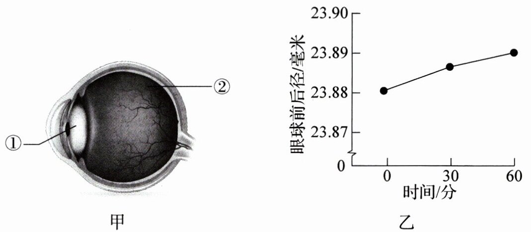 8. 眼是获取外界信息的重要结构,青少年要科学用眼,保护视力。图甲为人眼球的基本结构示意图,图乙为视力正常的成年志愿者在弱光照下阅读,科研人员测得阅读前(0分钟)、阅读30分钟和60分钟时眼球前后径的数值。请据图和所学知识分析回答下列问题。