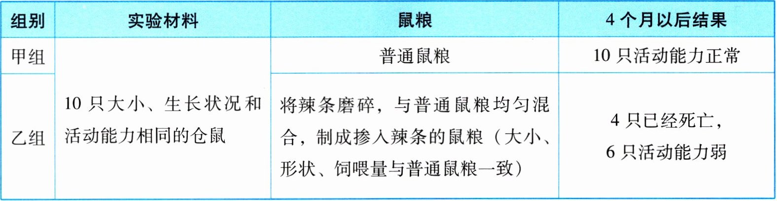 |乙组|10只大小、生长状况和活动能力相同的仓鼠|将辣条磨碎,与普通鼠粮均匀混合,制成掺入辣条的鼠粮(大小、形状、饲喂量与普通鼠粮一致)|4只已经死亡,6只活动能力弱|