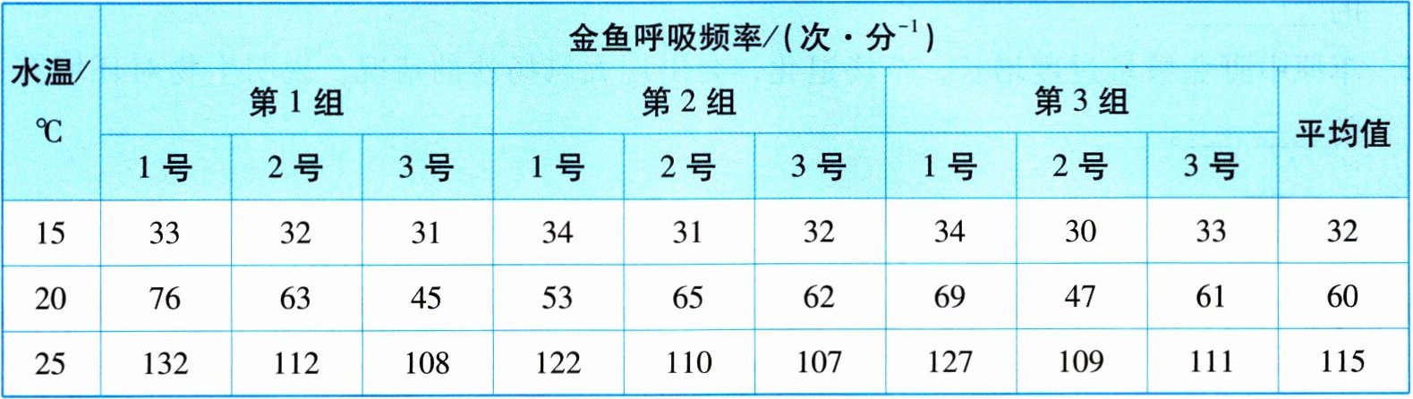 7. 某生物兴趣小组为了解金鱼的呼吸频率与水温的关系,开展了实验探究,获得了以下实验数据,请你结合表格回答下列问题。