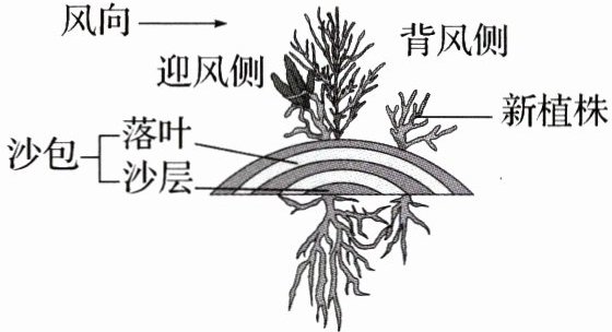 ②柽柳属植物可将吸收到体内的盐分通过泌盐孔排出体外,枯枝落叶中的盐分常与沙粒粘在一起,形成 “红柳沙包”。随着柽柳的生长,图中所示的隆起沙包逐渐