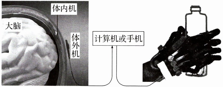 (3)科研人员将脑机接口的体内机植入患者的颅骨内,负责收集大脑皮层神经细胞产生的神经冲动,然后通过体外机将其传送到计算机或者手机上,实现脑机接口通信,再通过脑电活动驱动气动手套,帮助患者实现自主喝水。其中,计算机或手机相当于反射弧中的