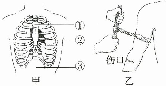 (填图中标号)。(3)图乙表示人体伤口出血部位和压迫止血部位,由此判断,出血的血管类型是