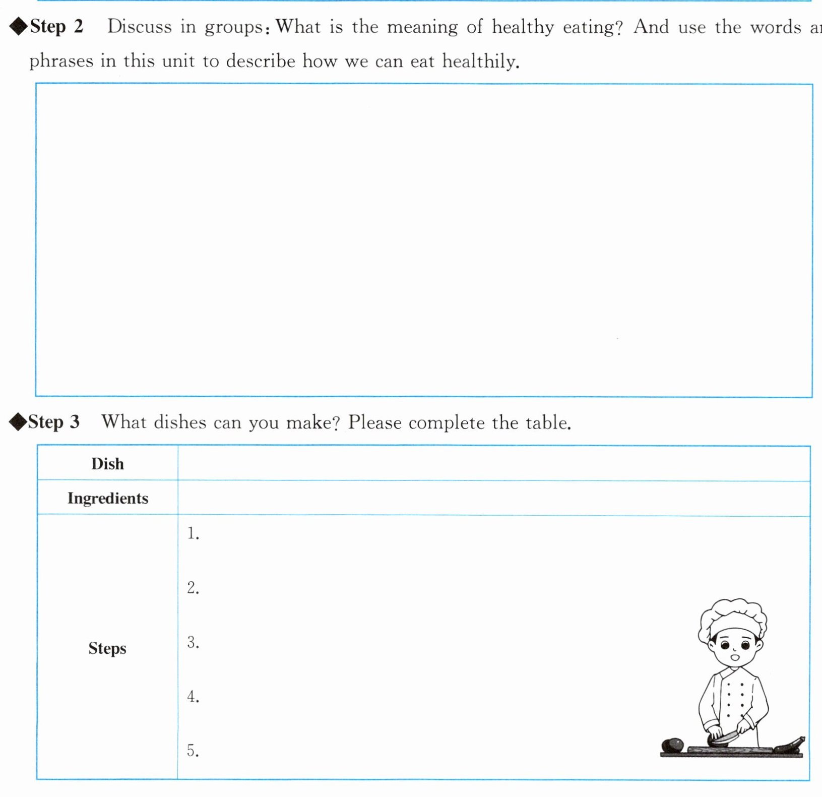 Step 2 Healthy eating means having different kinds of food to get enough nutrition. We should eat more vegetables and fruit, less meat. We need to have three meals on time.
