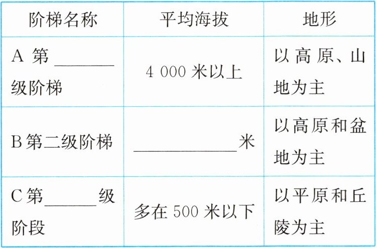 级阶梯。| 阶梯名称 | 平均海拔 | 地形 |