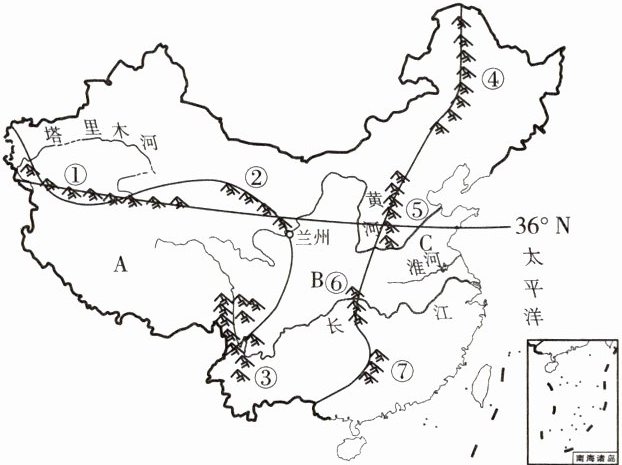 2. 位于地势第一、二级阶梯分界线上的山脉有①昆仑山脉、②